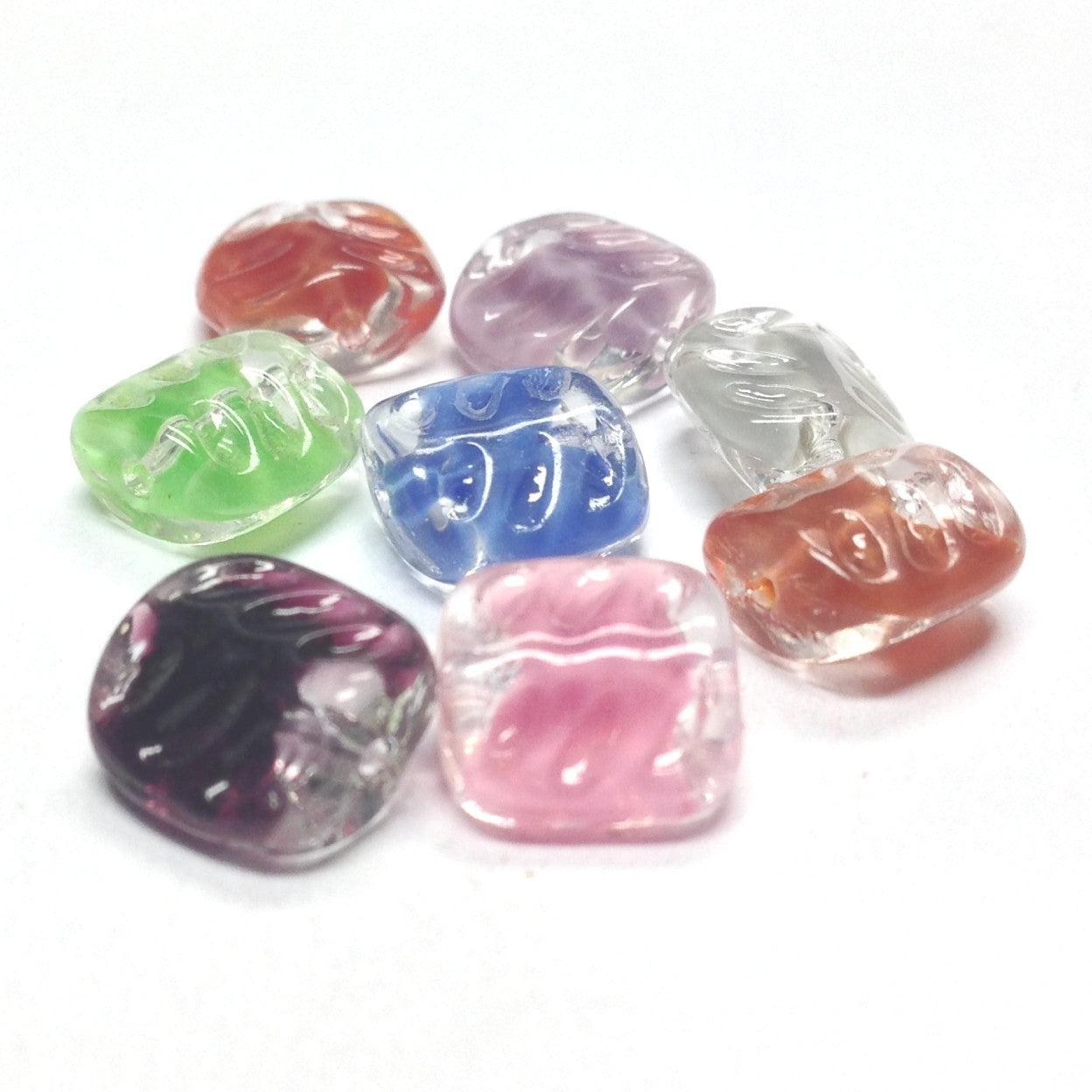 These 12mm brown and crystal givre glass square beads are 7mm thick. The surface is engraved on both sides. The material produces a slight variation in pattern from bead to bead. Made in Germany in the mid 1960s.