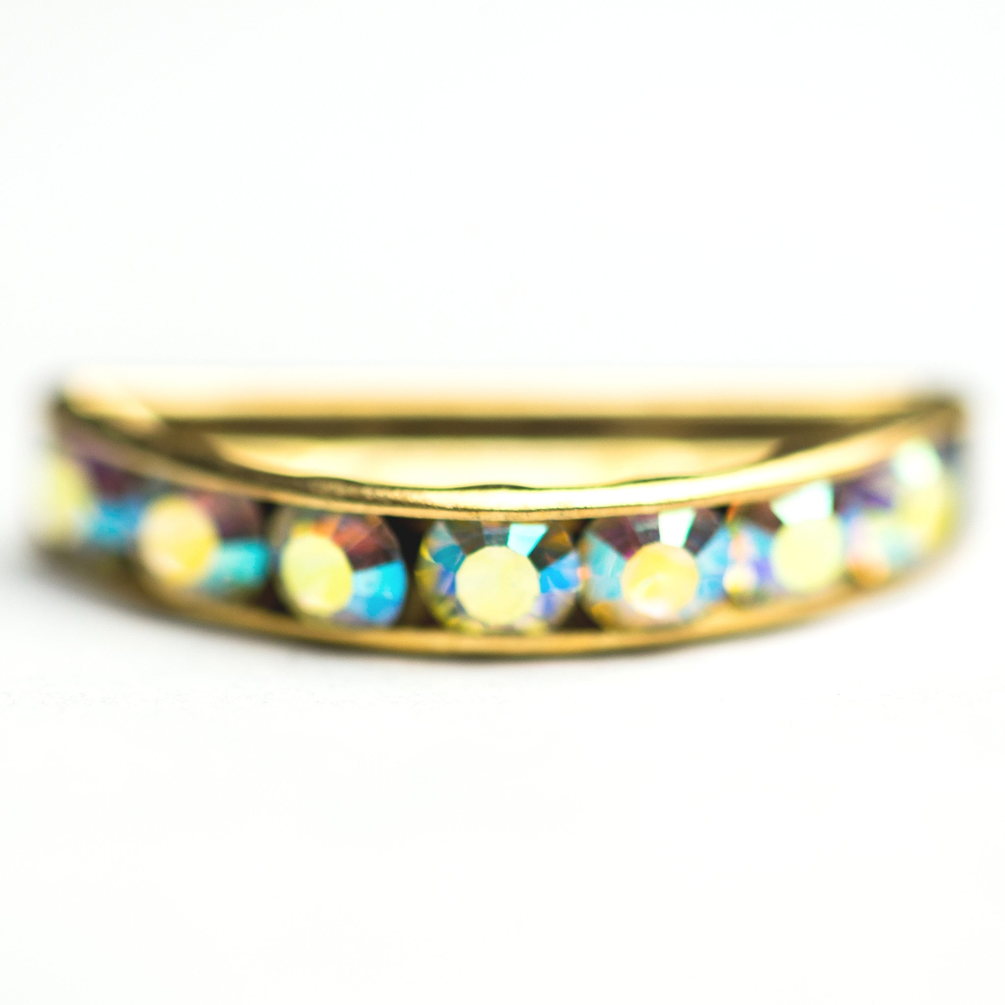 This rhinestone half moon rondelle is made with faceted round crystal AB stones in settings made of gold plated brass. The rondelle measures 19x7mm and has 7 PP25 chatons that are channel set without prongs. Two stringing holes run side by side. Made by Swarovski.