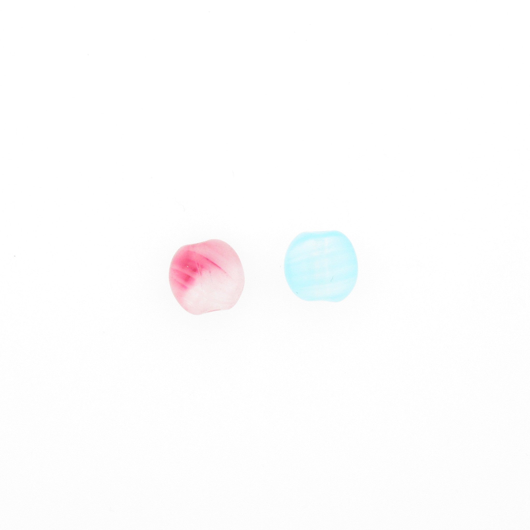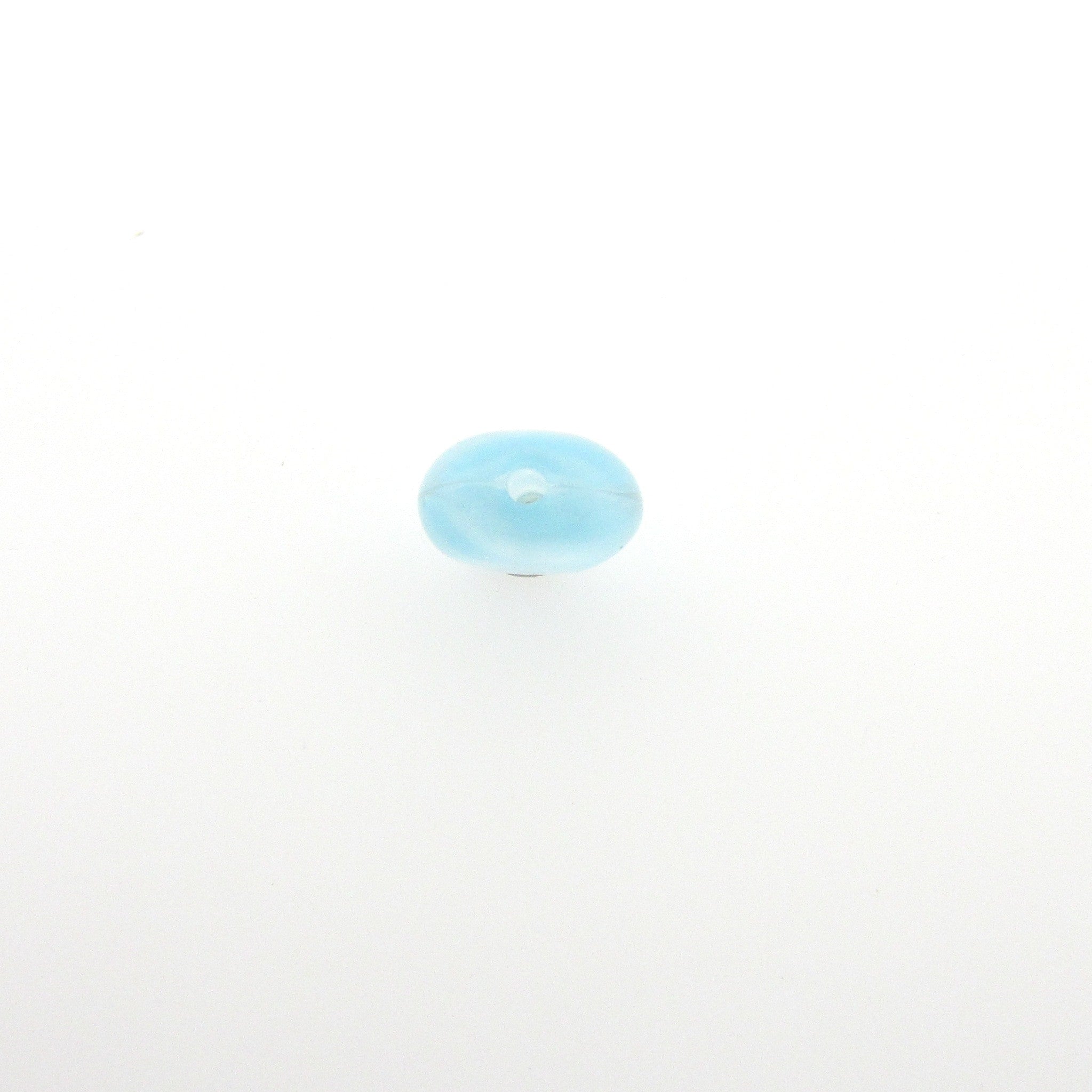 These 8mm aqua quartz glass beads have a thickness of 4.5mm, with a gentle rounded shape. The glass varies slightly from bead to bead. Made in Germany in the early 1970s.