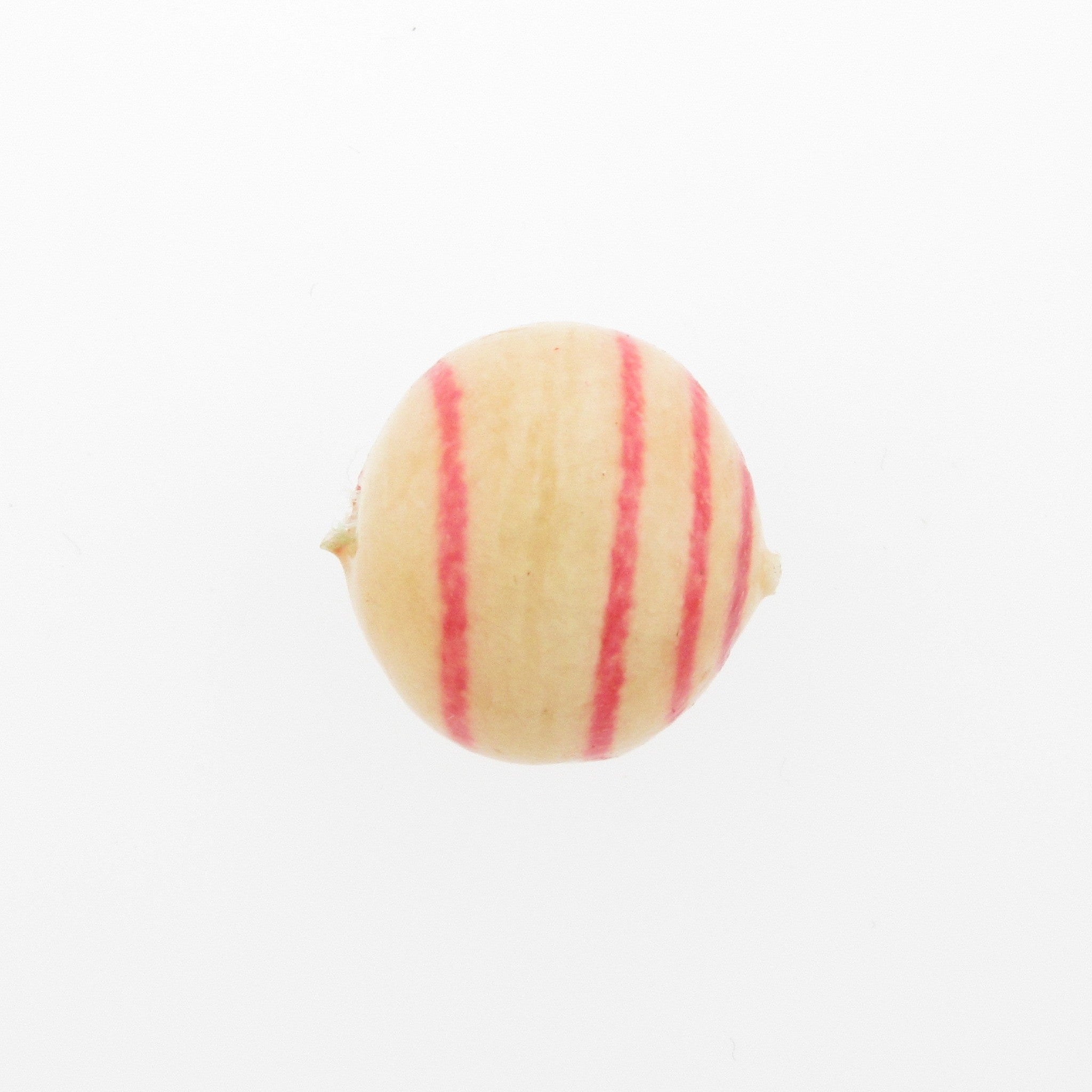 These 20mm round paper mache beads are have a shiny irregular pink stripe lacquer finish over an ivory base. Each piece varies from piece to piece, and is hand made in Germany.